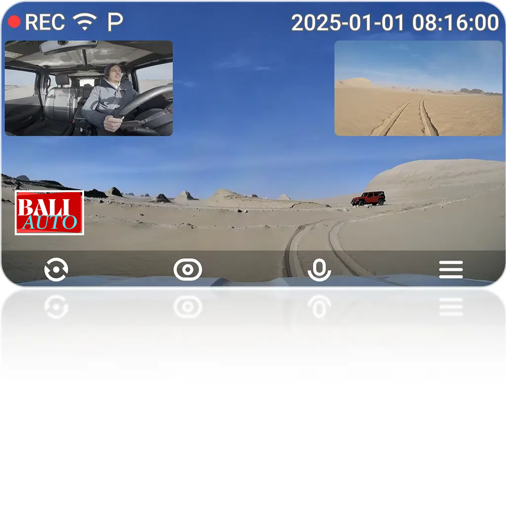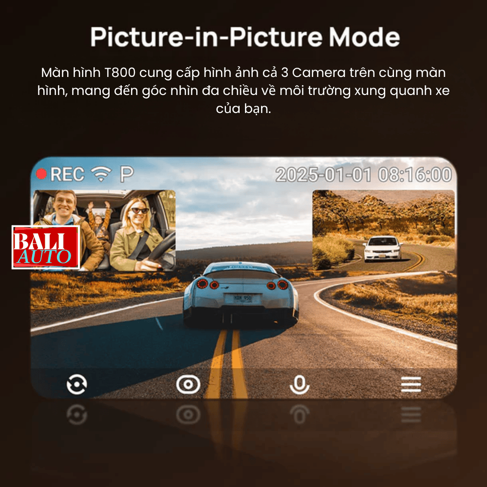 Camera hành trình 4K T800 cho phép bạn xem đồng thời hình ảnh phía trước, phía sau và bên trong xe trên màn hình thiết bị. Màn hình đa góc này mang đến cho bạn góc nhìn toàn diện về môi trường lái xe, cả bên trong lẫn bên ngoài xe, đảm bảo sự bảo vệ toàn diện và an tâm.