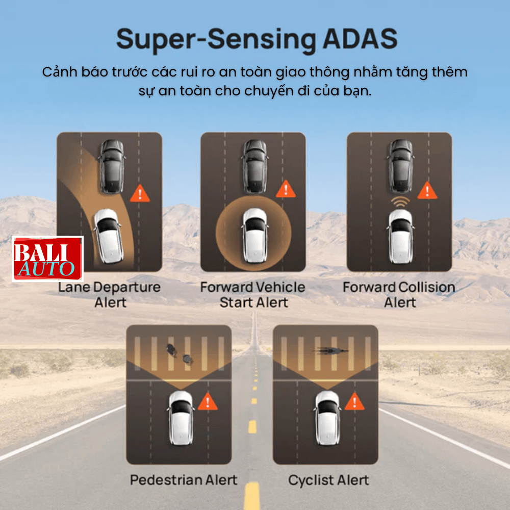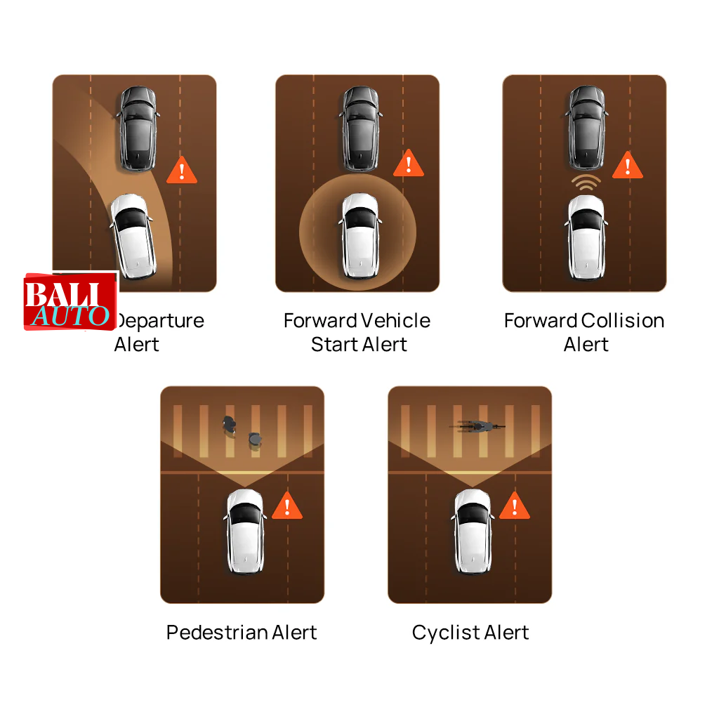 Cảnh báo trước để giảm thiểu nguy cơ lái xe: chệch làn đường, xe phía trước khởi hành, va chạm phía trước và thêm thông tin nhận dạng người đi bộ và người đi xe đạp để tăng thêm độ an toàn cho hành trình của bạn.