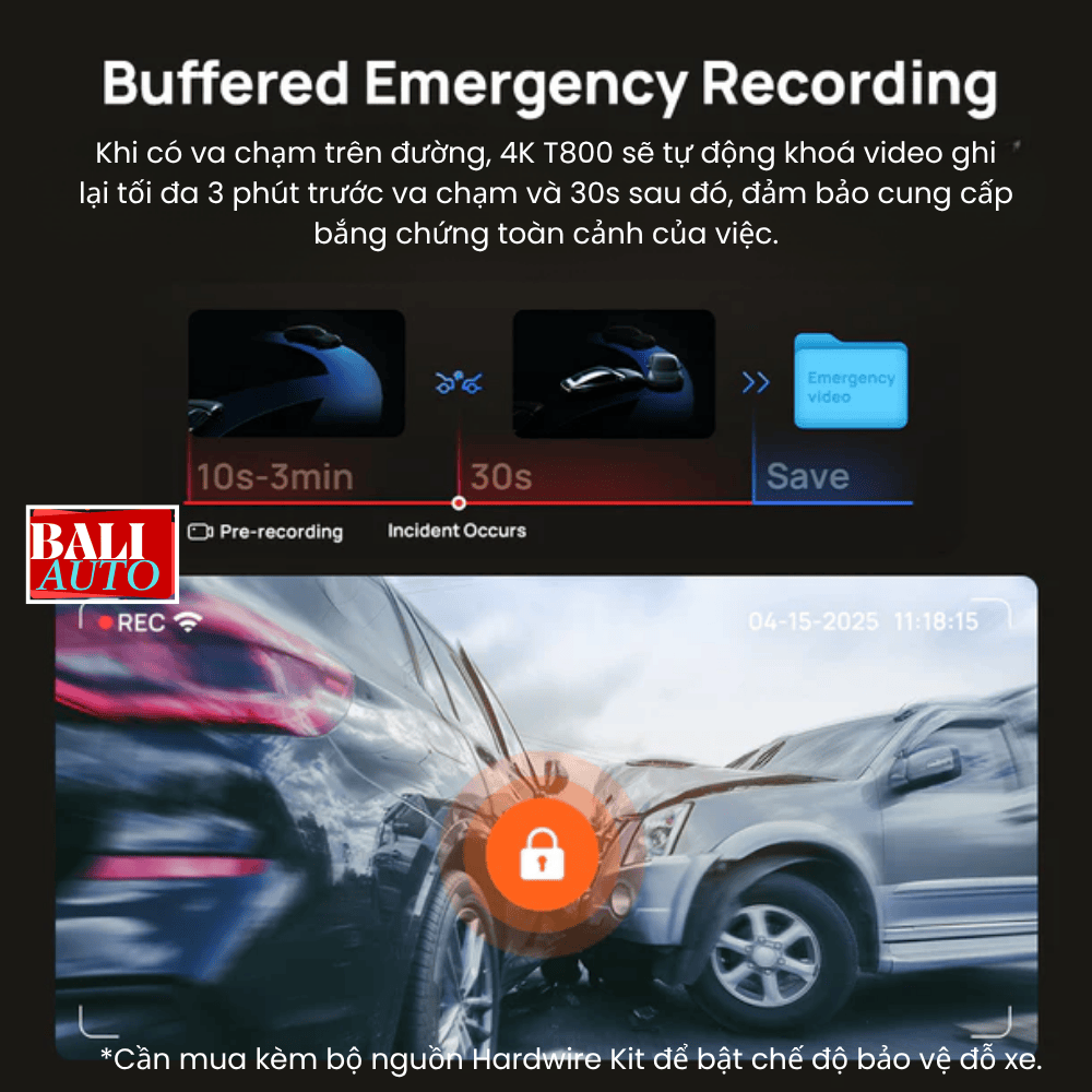 Camera 4K T800 hiện đã được nâng cấp tính năng Khoá video va chạm khẩn cấp , mở rộng bộ nhớ đệm lên đến 3 phút*. Camera sẽ ghi lại cảnh quay trước va chạm có thể lên tới 3 phút, khoảnh khắc va chạm chính xác và 30 giây sau đó . Những đoạn phim quan trọng này được lưu trong thư mục "Video Khẩn cấp" chuyên dụng, tránh bị ghi đè bởi các bản ghi thông thường. Tính năng này hỗ trợ rất nhiều cho việc tái hiện tai nạn và giúp bảo vệ bạn khỏi gian lận bảo hiểm và cáo buộc sai sự thật.