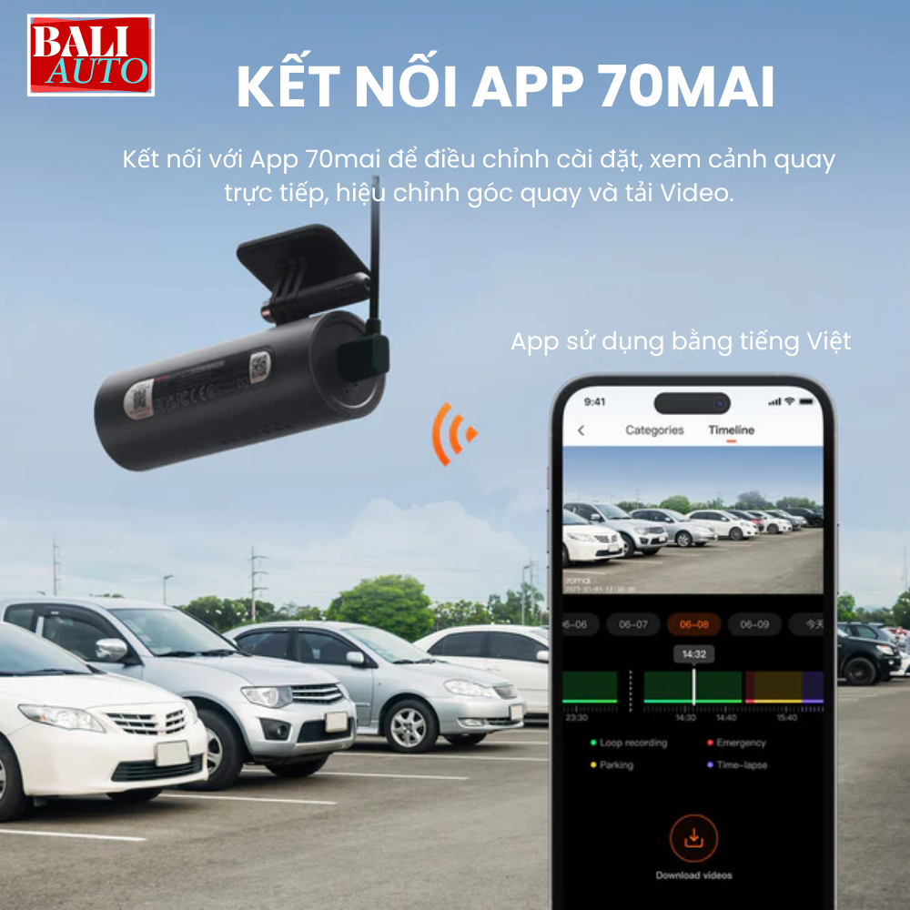 Kiểm soát bằng APP: Điều chỉnh cài đặt, xem cảnh quay trực tiếp, ghi lại những khoảnh khắc quan trọng và tải xuống tệp tại APP 70mai.
