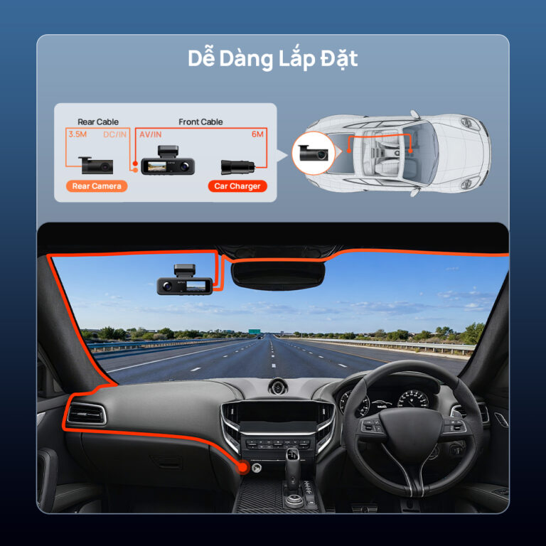 Chỉ cần kết nối camera trước với tẩu sạc ô tô và nối camera sau qua cổng AV/IN là bạn đã sẵn sàng sử dụng. Lắp đặt linh hoạt trên nhiều dòng xe – hoàn thiện nhanh chóng mà vẫn đảm bảo tính thẩm mỹ và an toàn khi vận hành.