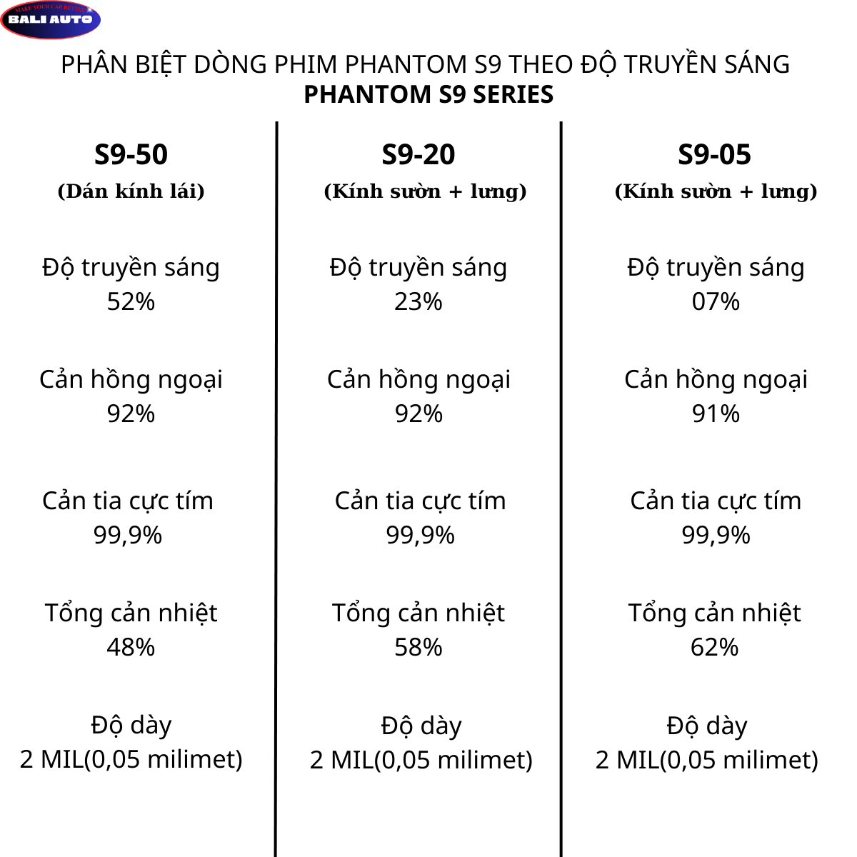 Bảng so sách tính chất của phim cách nhiệt dòng PHANTOM S9 khi phân chia theo độ truyền ánh sáng: